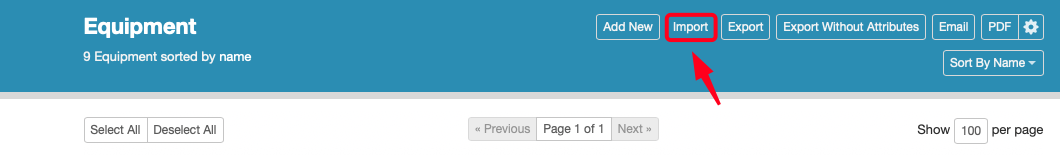 You can bulk update the names for equipment by using the Import tool option in the main Equipment section. To set up the import, you will want to make a spreadsheet with one column for the 'Original Name' and another column for the 'Updated Name'. Once the spreadsheet is setup, then you can click the Import button in the equipment section to set up the import:
