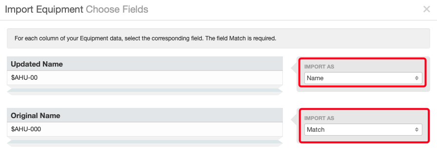This will allow the Import tool to find the equipment based on their original name and then update their names using the values in the Updated Name column.